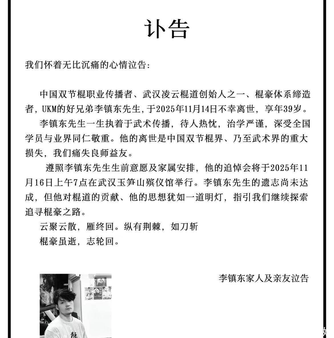 可能你对这个名字没那么熟,但凌云棍道相信有不少人对他情有独钟,而这个团体就是由李镇东等人创立的。噩耗据公开的讣告显示,李镇东是在14号下午辞世的,年纪只有39岁。追悼会安排在16号,也就是今天早上七点,在武汉玉笋山殡仪馆举行。